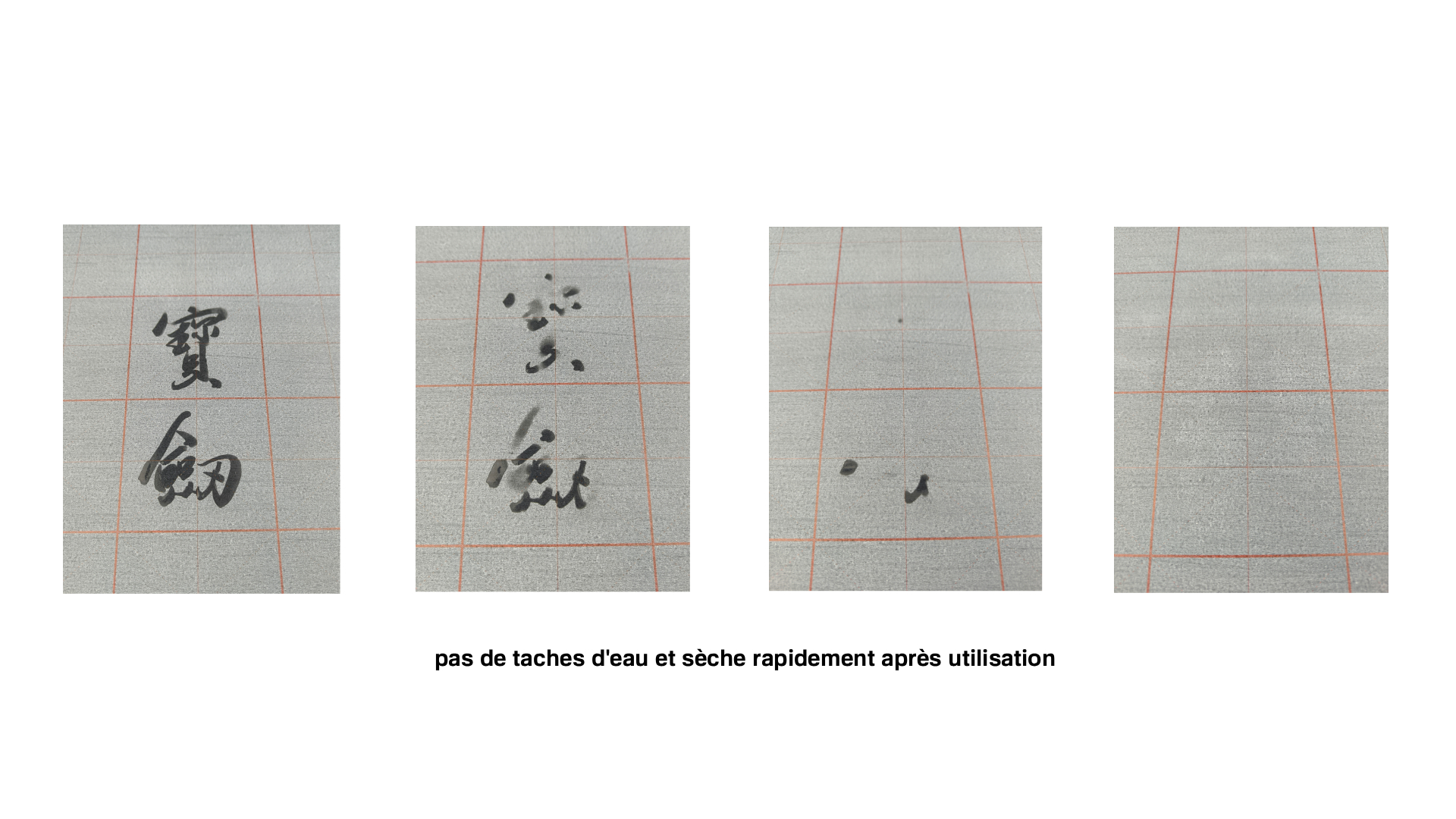 Avec seulement un pinceau de calligraphie chinoise et de l’eau pour écrire. Après quelques minutes, l’eau sera sèche et l’écriture disparaîtra. Vous n’avez plus à vous soucier du problème d’encre