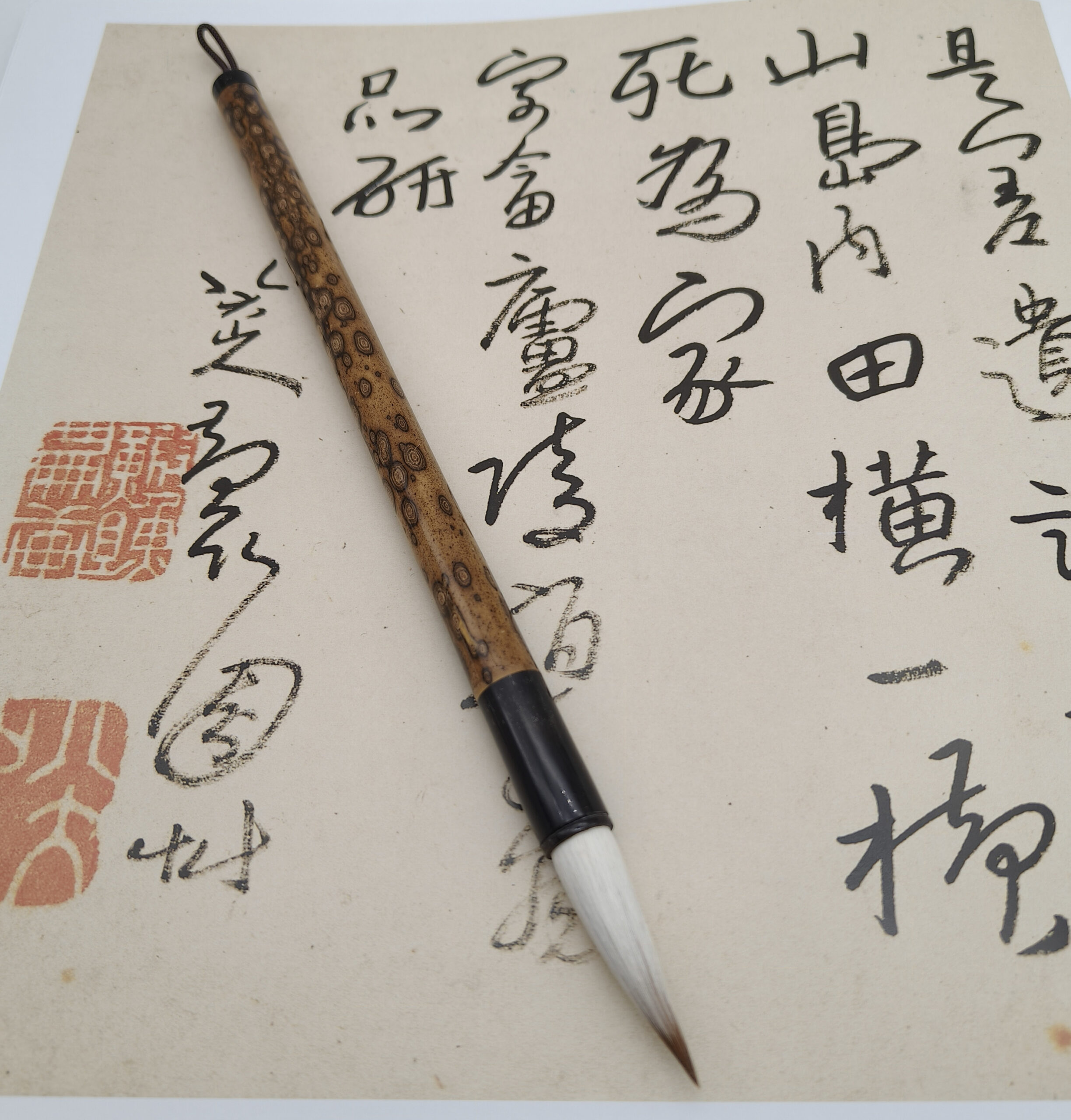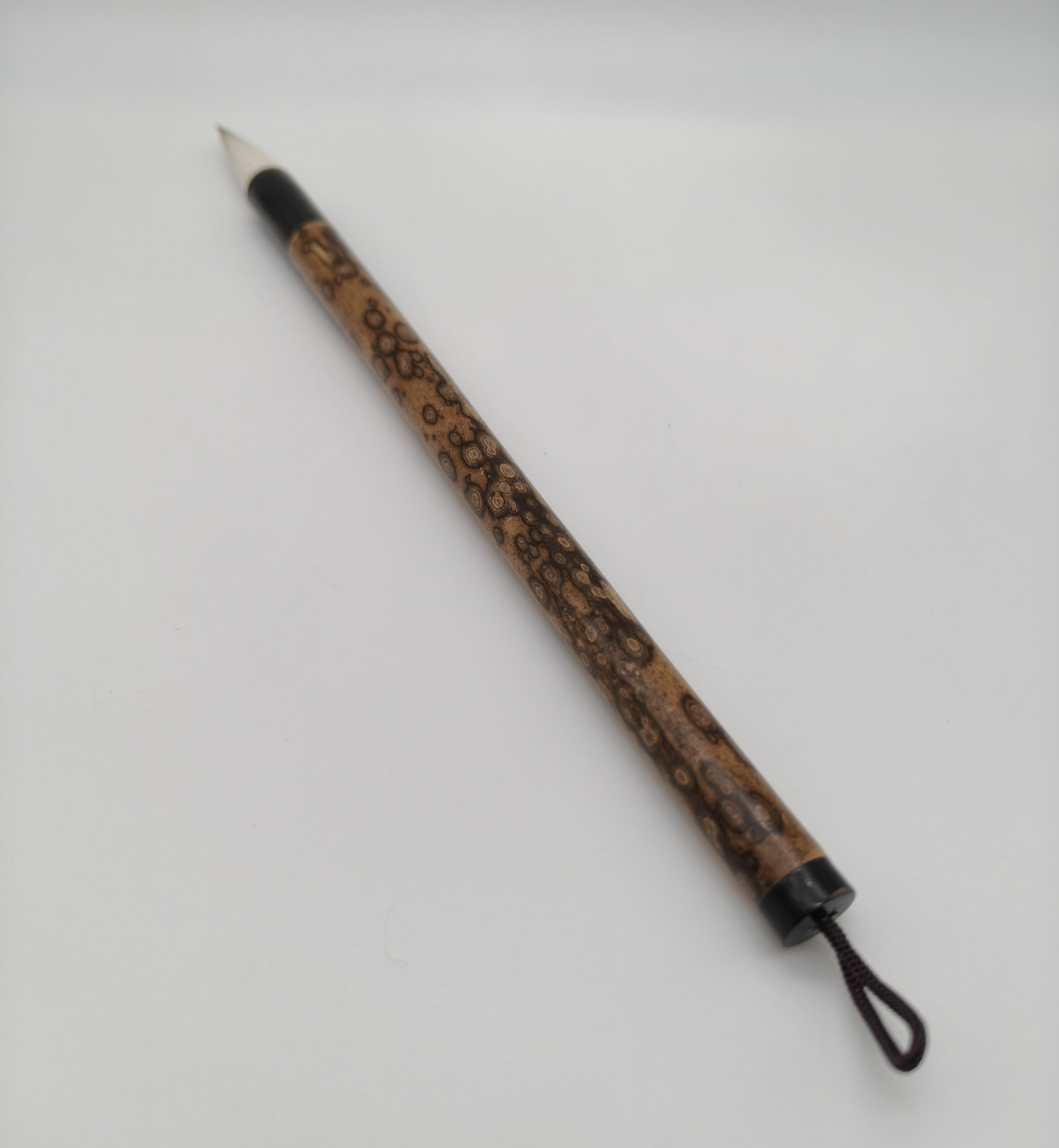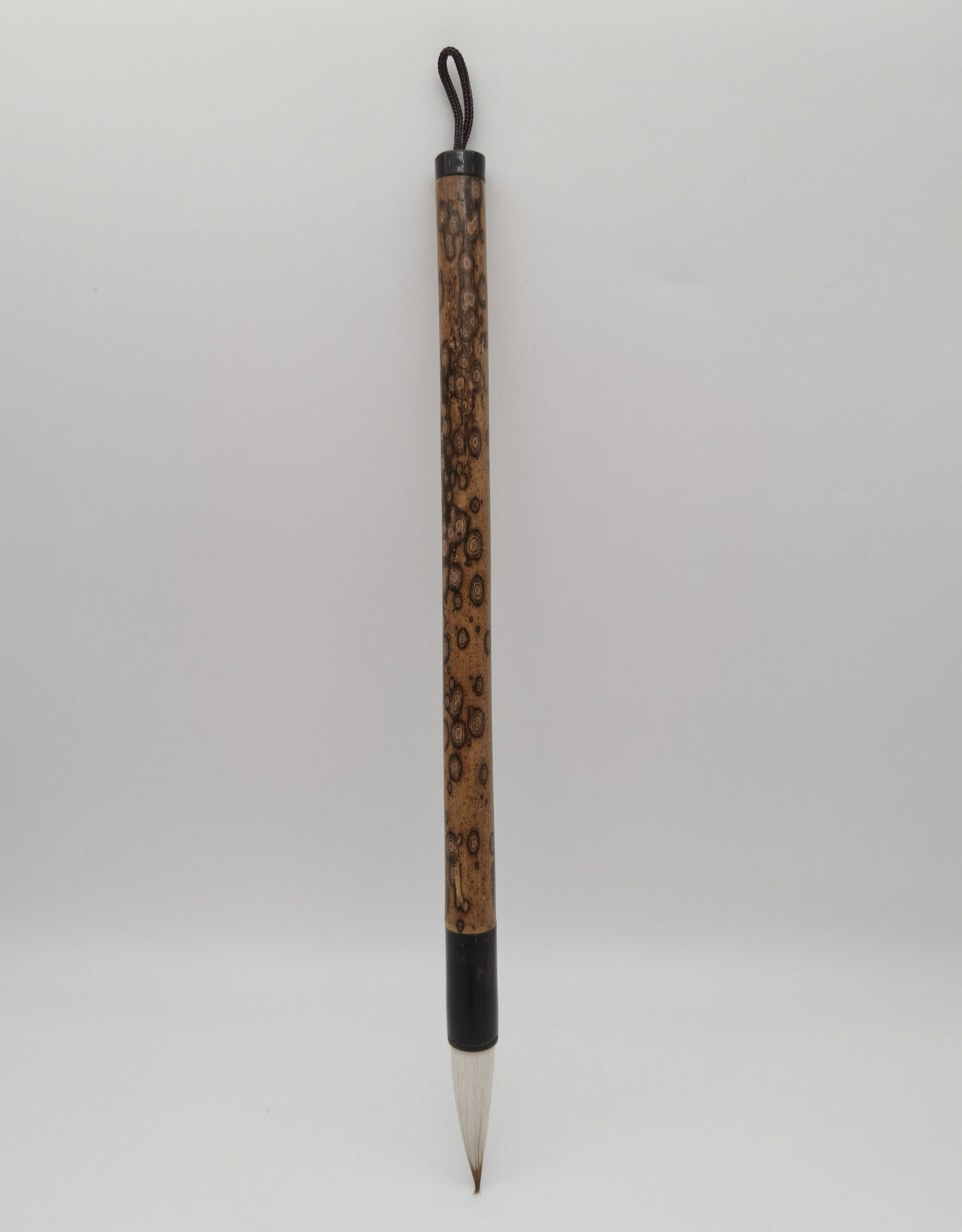 *Manche en bambou Meilu : les tiges sont naturellement recouvertes de motif brun foncé, ressemblant à des fleurs de prunier éparpillées, avec de fines marques naturelles évoquant le pelage d’un cerf. D’où le nom Meilu 梅鹿 (梅 fleurs de prunier ; 鹿 cerf).